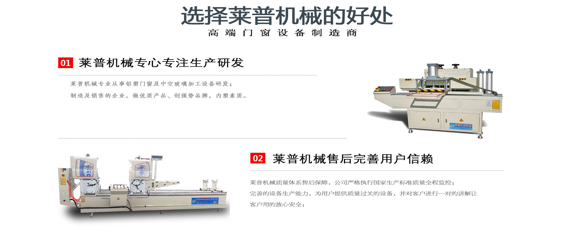 济南莱普机械设备有限公司是专业从事铝塑门窗及中空玻璃加工设备研发、制造及销售的企业。做优质产品、创强势品牌,内塑素质,外树形象,以其高、精、尖、专的运营模式,良好的口碑。 公司一直坚持“信誉赢得成功,品质创造未来”的经营理念,坚持“追求卓越,创造价值”的质量方针,不断吸取国内外先进技术和管理经验,不断提高企业管理水平、产品质量,实现把好的产品,交给客户”的经营宗旨。